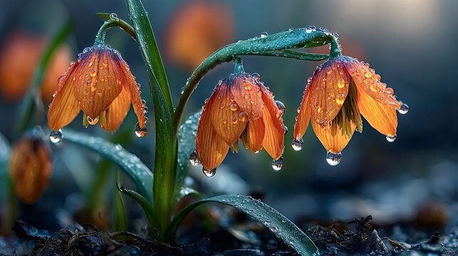Beautiful orange crown imperial fritillaria flowers are bending over, covered in glistening dew drops in a natural outdoor setting with a softly blurred background
