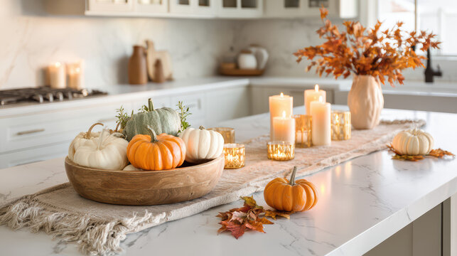 Autumn pumpkins and candles style a bright marble kitchen island. A rustic centerpiece with white and orange gourds, glowing votives, and maple leaves creates cozy seasonal decor.