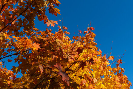Autumn background for design. Yellow, red and orange leaves of trees against the blue sky.