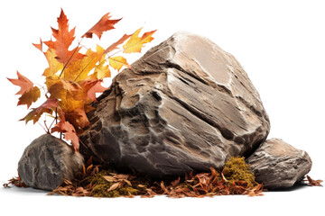 stone rock with dry autumn grass around and orange leaves, png file of isolated cutout object on transparent background.