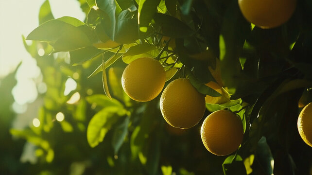 Orange orchard with ripe citrus fruits growing outdoors