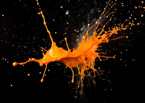 Dynamic orange paint splash against a black background capturing movement and energy during an art experiment
