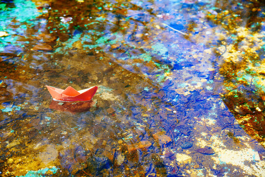 Origami paper boat floating in colorful vibrant puddle outdoors