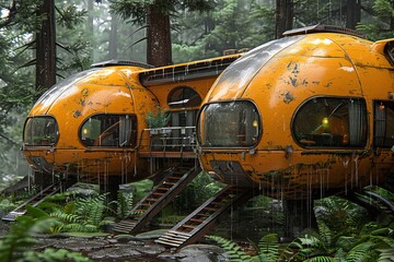 Unique futuristic orange pods nestled in a lush green forest during a rainy day, blending nature with innovative design