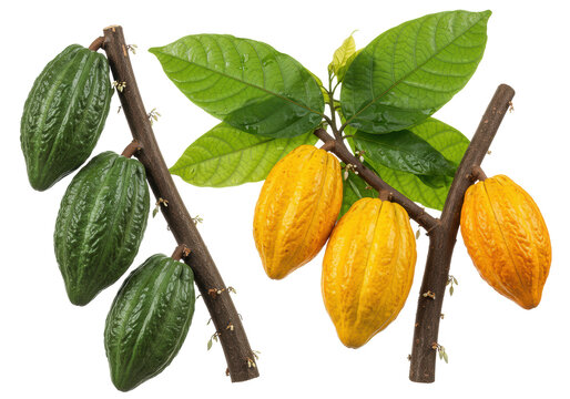 Two ripe orange cocoa pods and dried cacao beans lie beside green leaves on a bright textured surface