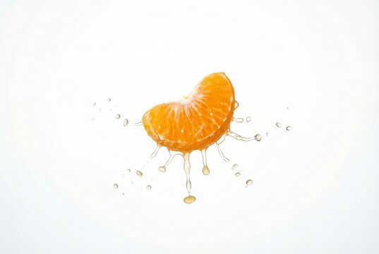 Fresh orange segment splashing into orange juice creating a refreshing splash