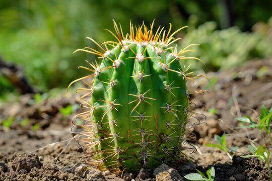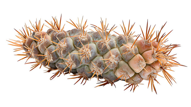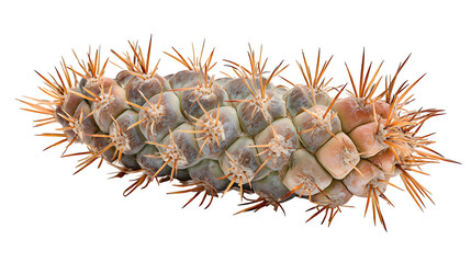 Closeup of a cylindrical cactus with sharp orange spines and geometric patterns against a showcasing desert flora beauty
