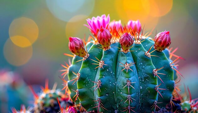 Up-close cactus with pink buds and vivid orange spines, against a soft, bokeh background