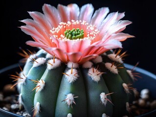 Close-up of a blooming round green cactus with sharp orange spines and a large delicate pink flower with white stamens on top against a black background