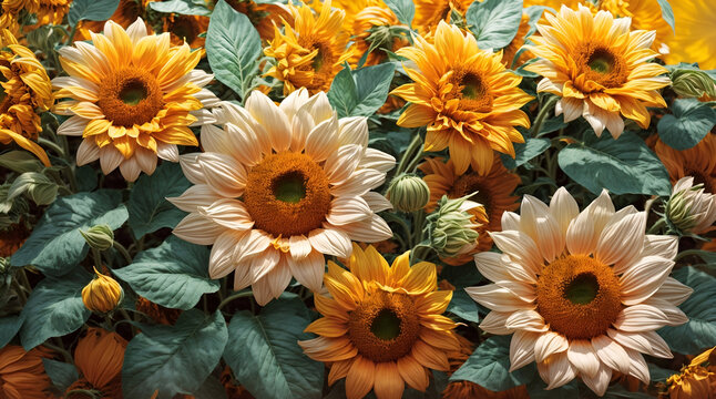 Botanical pattern of sunflowers with reddish leaves on beige backdrop