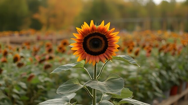Orange sunflower field. Generative AI technology.