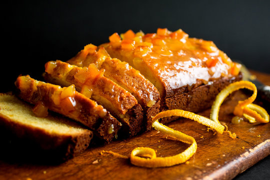 Close up of sliced orange marmalade cake on wooden cutting board