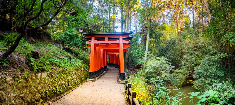 Japan. Kyoto. The Mountain Of Inariyama. The orange gates of Fushimi Inari Shrine. Fushimi Inari Taisha temple in Kyoto. The road to the gate of the temple of Fushimi Inari. Shinto.