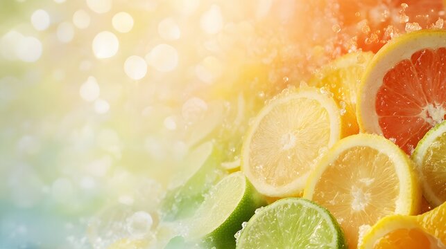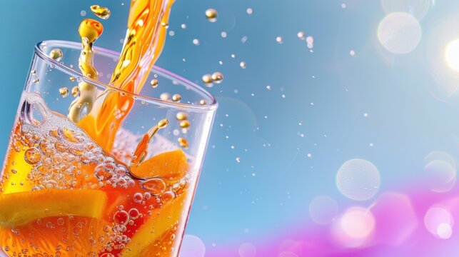 Refreshing Citrus Drink with Splashes and Bubbles in a Glass Against a Colorful Background