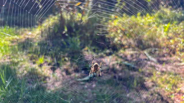 Spider at the center of a flawed orb web, holding prey. Backlight illumination with blurred forest background and bokeh effect.