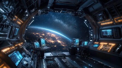 Futuristic spaceship cockpit with a view of Earth from space.