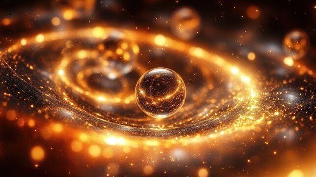 Ornate golden orb radiating light with flowing spheres in cosmic nebula