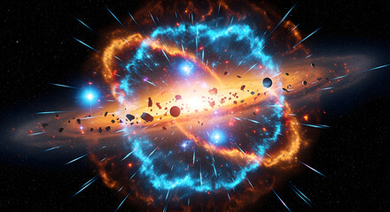 A celestial scene of an exploding star with an array of planets and cosmic debris orbiting the energetic core
