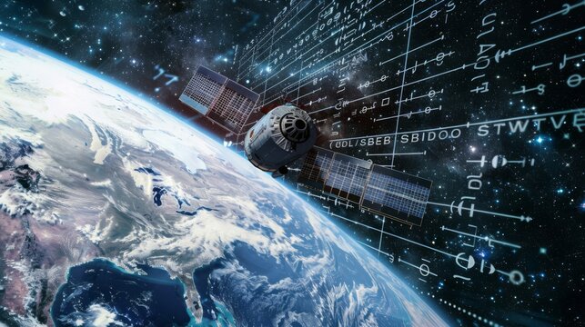 A satellite orbits Earth, capturing the planet's beauty and vastness, surrounded by a starry space backdrop.