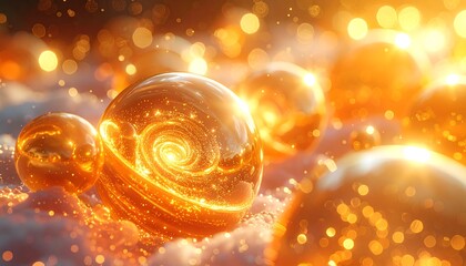 A vibrant abstract composition features numerous spherical orbs in warm hues of gold, orange, and blue against a dark space