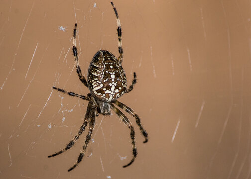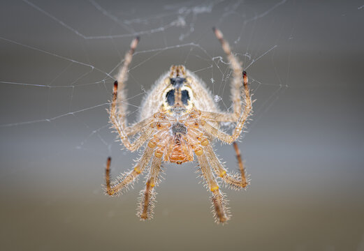 Bridge orbweaver spider Larinioides sclopetarius on web waiting for prey