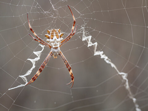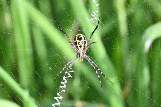 Silver garden spider (argiope, an orbweaver) on web showing stabilimenti and orb web.