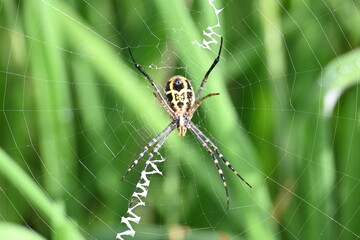 Argiope bruennichi or wasp spider. It is a species of orb- weaver spider found Europe, Asia and Africa. This species features distinctive yellow, white and black markings on its abdomen.