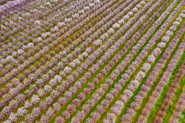 Rows of blooming almond trees, aerial photo taken in Northern California near Sacramento