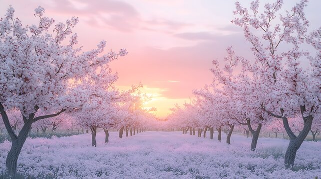A serene spring orchard with blooming fruit trees in soft pink and white under a pastel sunrise sky