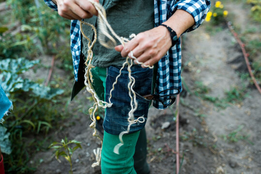 Farmer's hand in a protective glove gathering ripe, fresh kiwi fruit from the vine with a warm sun flare