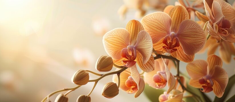 Close up of a live potted orange phalaenopsis orchid with copy space image available