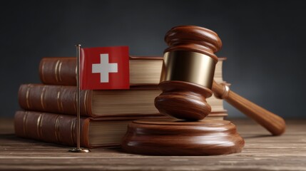 Swiss law symbols with flag and gavel on wooden background illustrating legal concepts and justice system in Switzerland