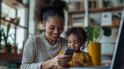 Young woman with baby speaks by phone and working with laptop on kitchen. Business Quarantine Concept