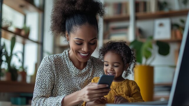 Mother talking on smart phone at home office, Generative AI