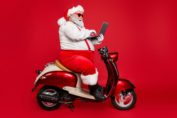 Profile side view of his he nice bearded funky big belly Santa sitting on moped holding laptop reading wish list e-mail winter fairy isolated on bright vivid shine vibrant red color background