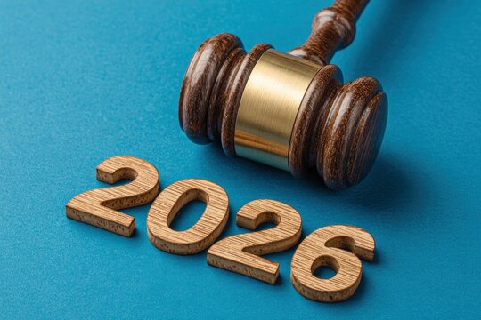 A striking close-up shot features a classic wooden gavel with a polished brass band, resting purposefully on a richly textured, vibrant blue surface. Alongside it, the numbers '2026' are distinctly di