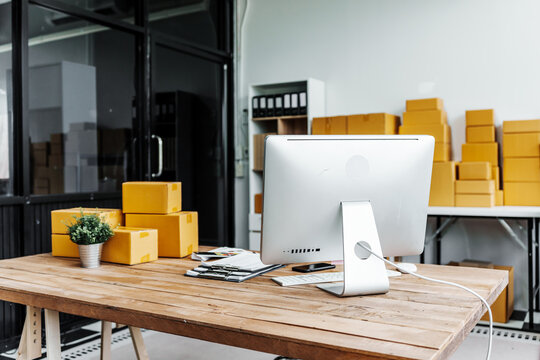 A wooden desk in an SME office, with a laptop, desktop computer, and a parcel cardboard box. The workspace is organized for efficient management, logistics, and order processing.