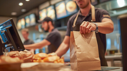 Chefs in industrial kitchen managing orders with hamburger graphics