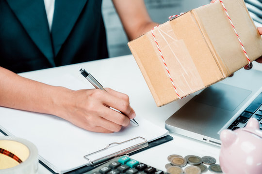 Small business concept. Woman hand with pen make a note of the product list for online shopping  order on white desk.