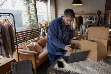 a young entrepreneur running an online store from home, packing orders and preparing shipping labels