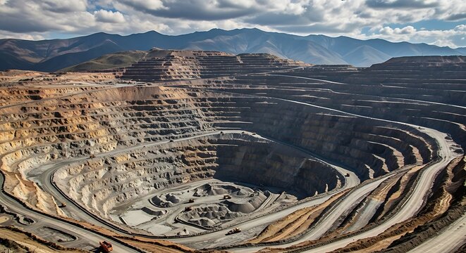 Iron ore texture close up - natural minerals in the mine. Stone texture of open pit. Extraction of minerals for heavy industry - the texture of the rock containing iron ore and copper.