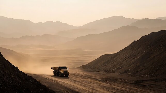 Dumper truck unloading rocks on snowy plateau in mountainous landscape
