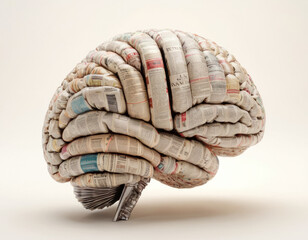 A human brain made of financial newspapers and stock charts, set against a white backdrop.