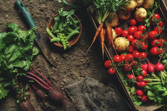 Fresh vegetables, potato, radish, tomato, carrot, beetroot in wooden box on ground on farm at sunset. Freshly bunch harvest. Healthy organic food, agriculture, top view