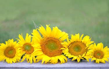 yellow sunflowers heads on table in garden close up, abstract natural background. symbol of summer season, harvest time. template for design. copy space