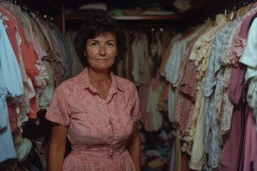 An elderly woman in a peach dress stands calmly in a closet filled with colorful dresses, exuding nostalgia and warmth in an organized space.
