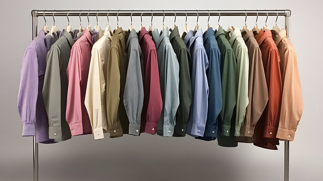 row of neatly arranged shirts in various calming shades hangs on metal rack, showcasing spectrum of colors from pastel to earthy tones, creating harmonious display