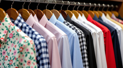 Assorted button down shirts hang on hangers showing various colors and patterns.