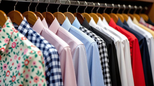 A diverse array of shirts, displaying various patterns and colors on hangers in a closet.
