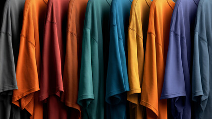 Row of colorful shirts in various shades, including orange, teal, and blue, hanging neatly in display. vibrant colors create visually appealing and organized presentation
